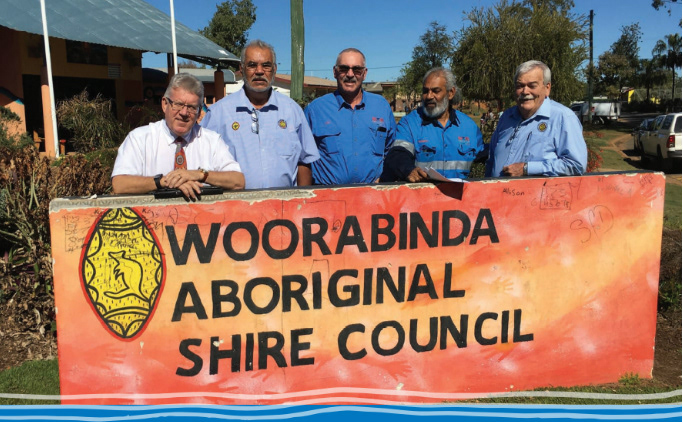 From left TMR Director-General Neil Scales; Mayor, Woorabinda Aboriginal Shire Council, Cheyne Wilkie; two representatives from Narimu Resources; and Works Manager, Dooley Perkins, Woorabinda Aboriginal Shire Council